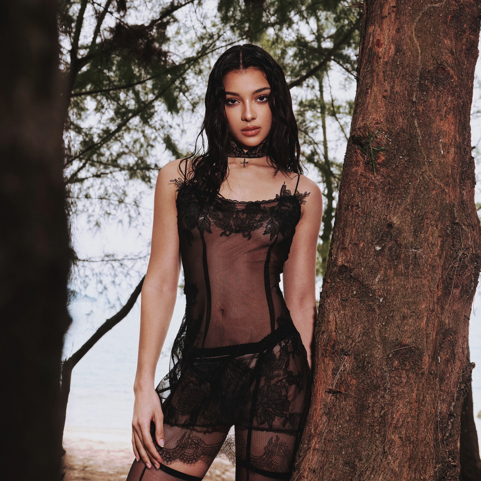Astrantia in Black blooms like a night flower beneath the stars—deep, grounded, and alluring. Soft mesh and intricate embroidery trace floral motifs across the curves, while the bodice combines sheer tulle and openwork lace for subtle definition. A lace-trimmed hem shifts with quiet, rhythmic movement.