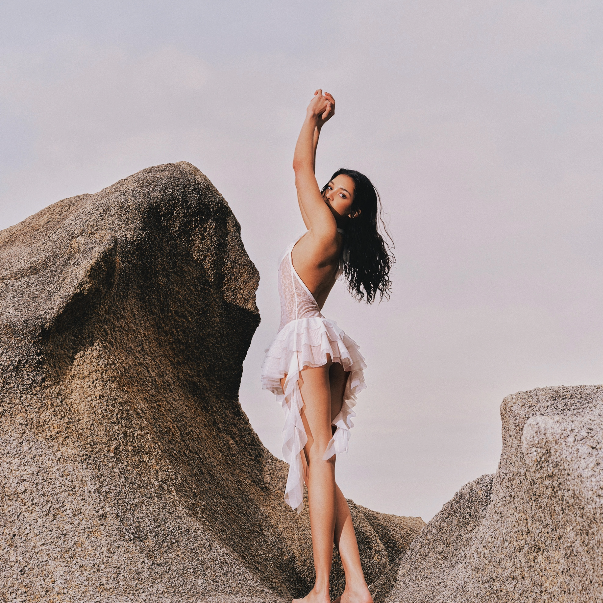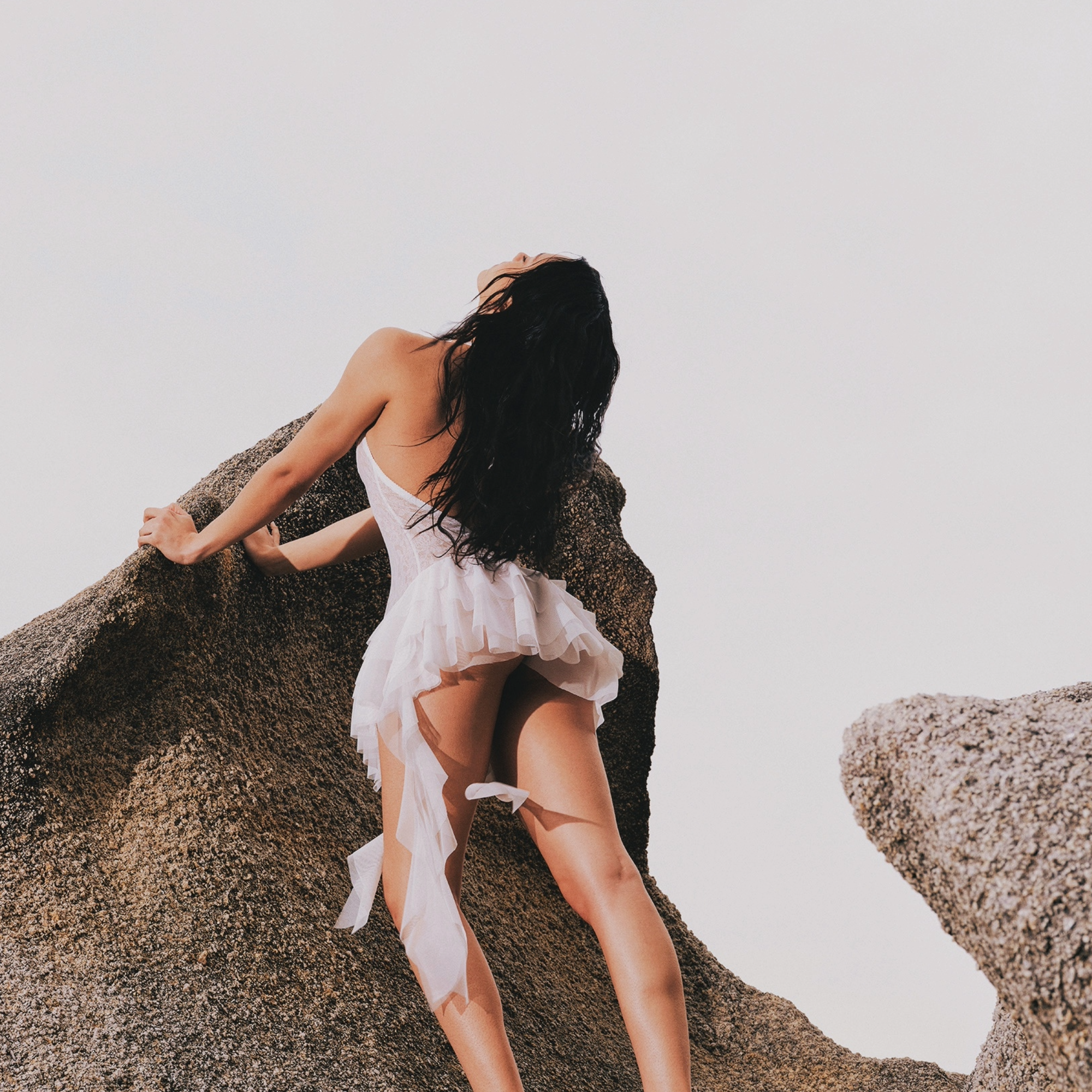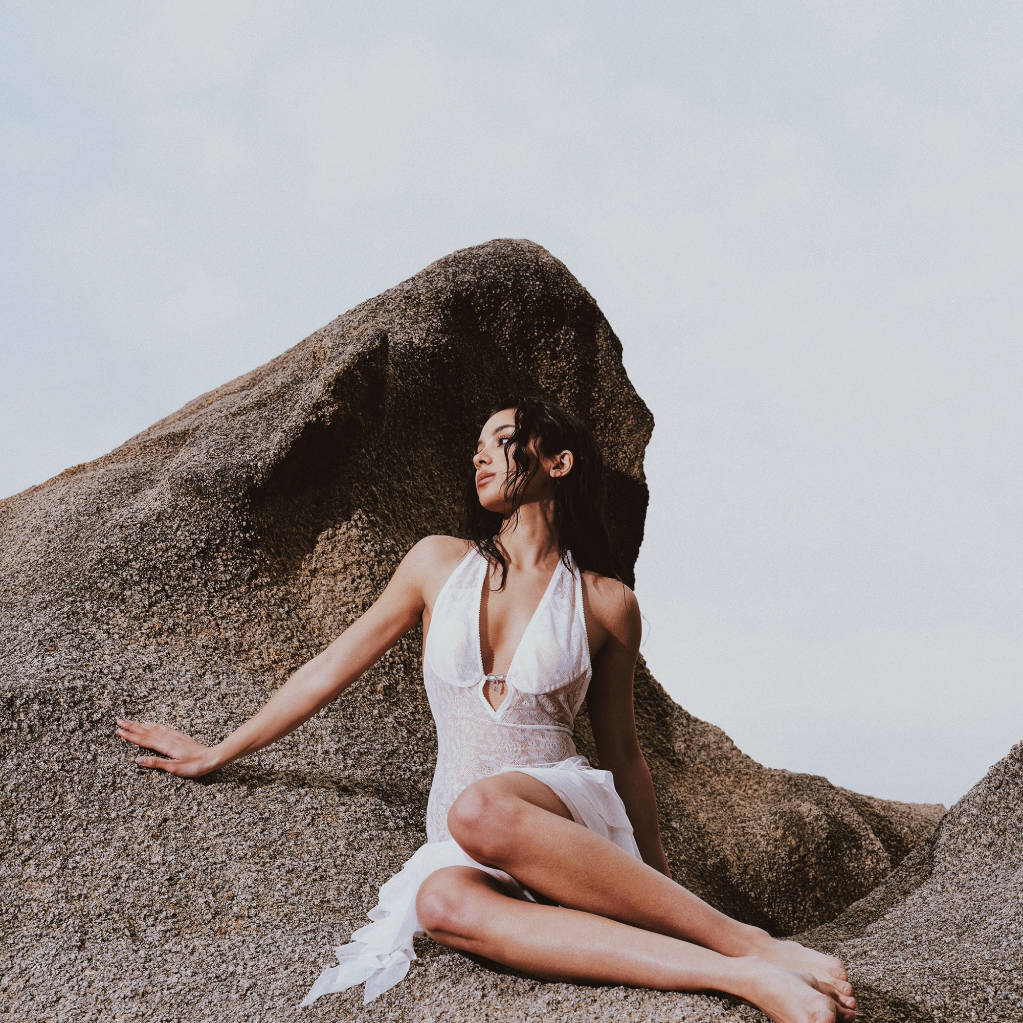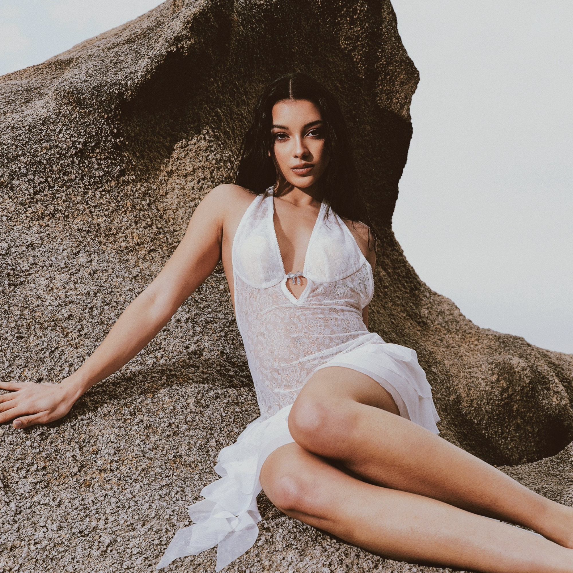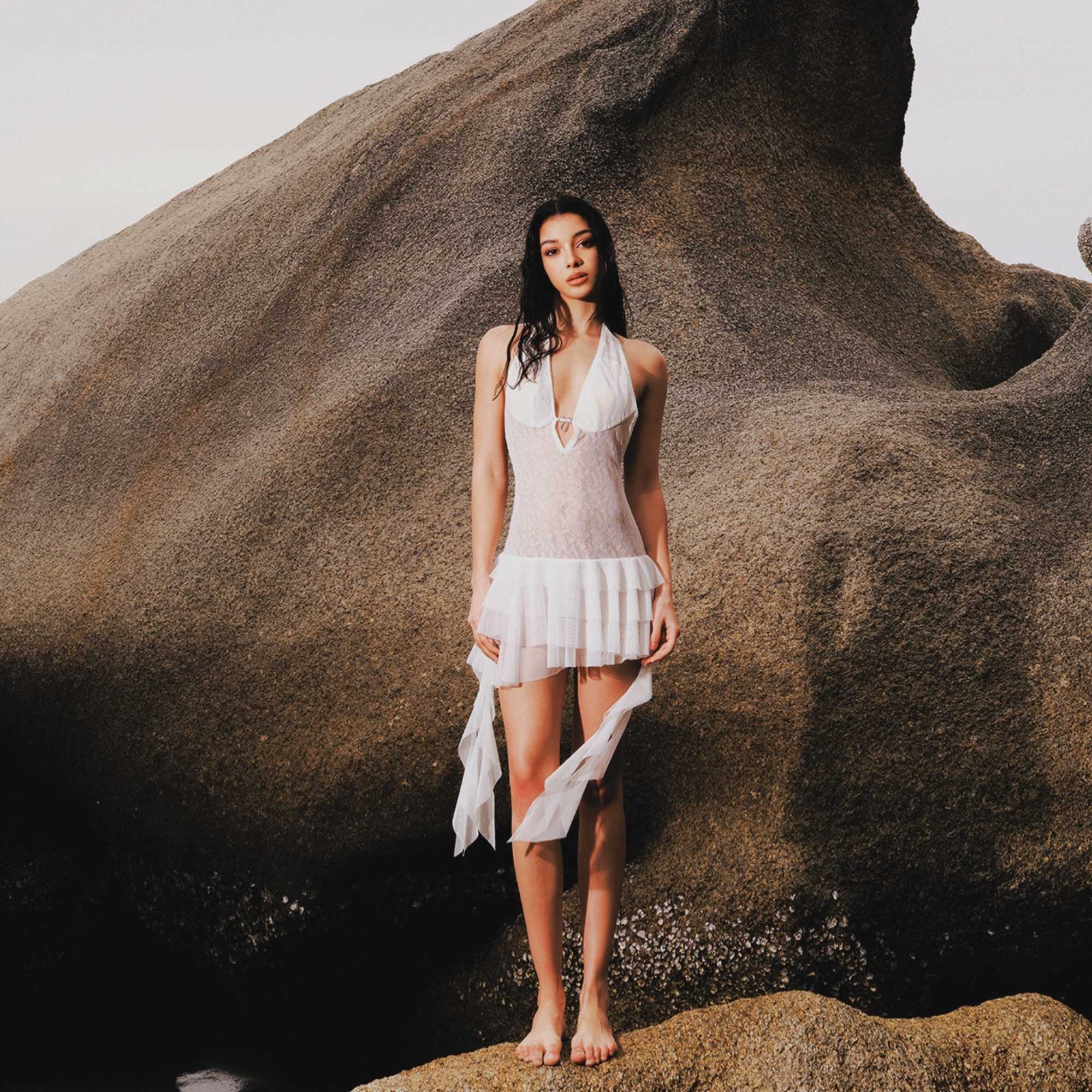 Delicate floral patterns trace the body, adding depth to the layers and enhancing its whimsical charm. In white, it embodies a surreal, sleepwalking sensuality—soft, luminous, and dreamlike, inviting the imagination to wander through its floating elegance.