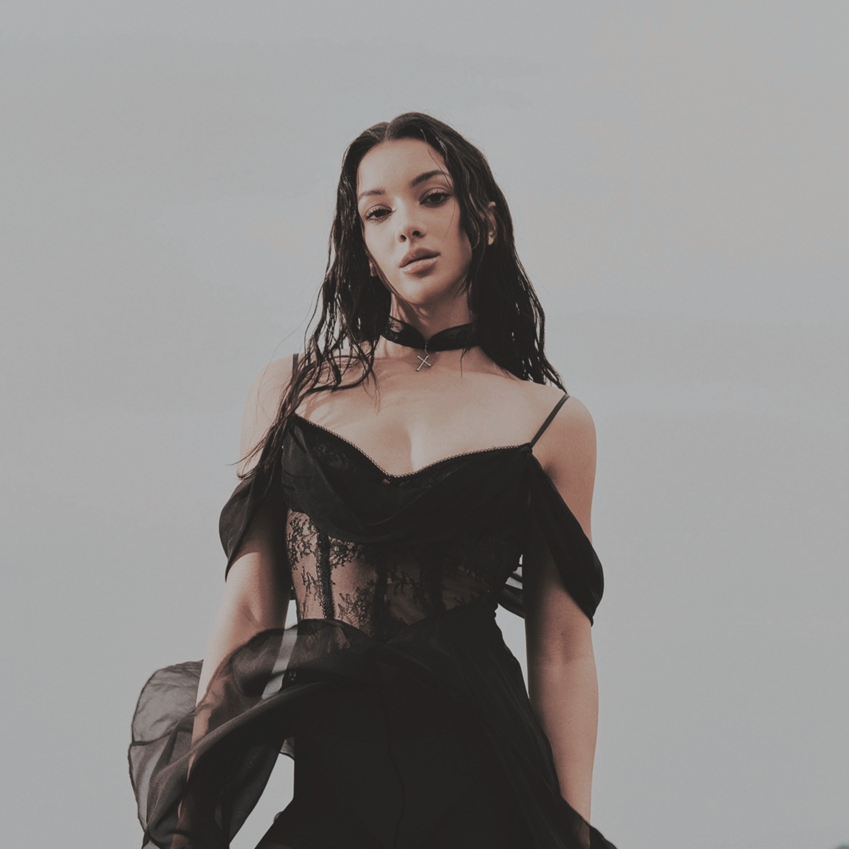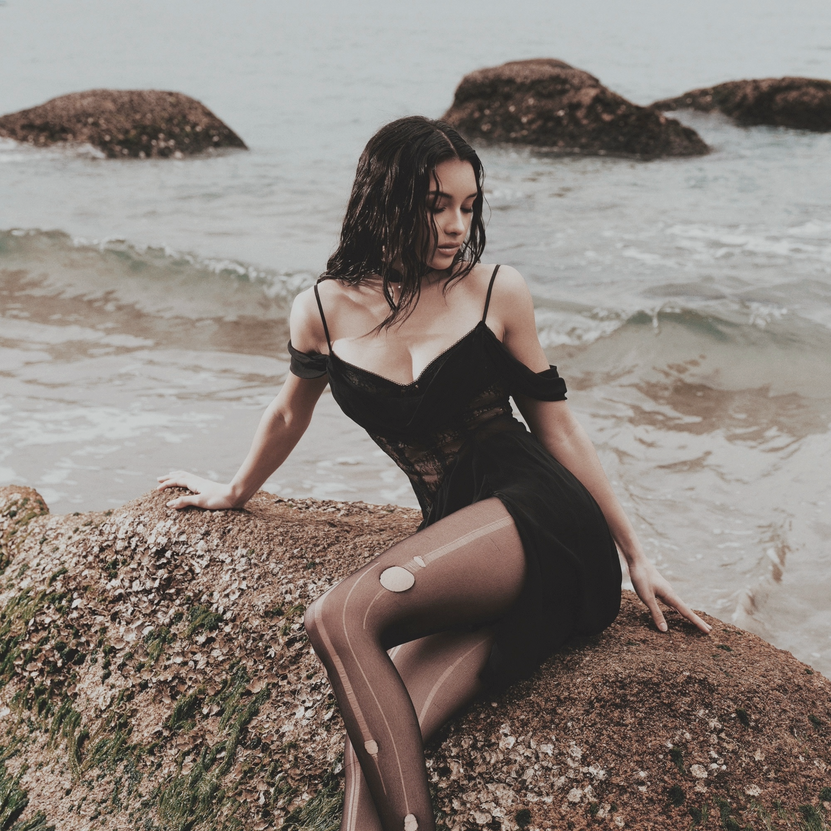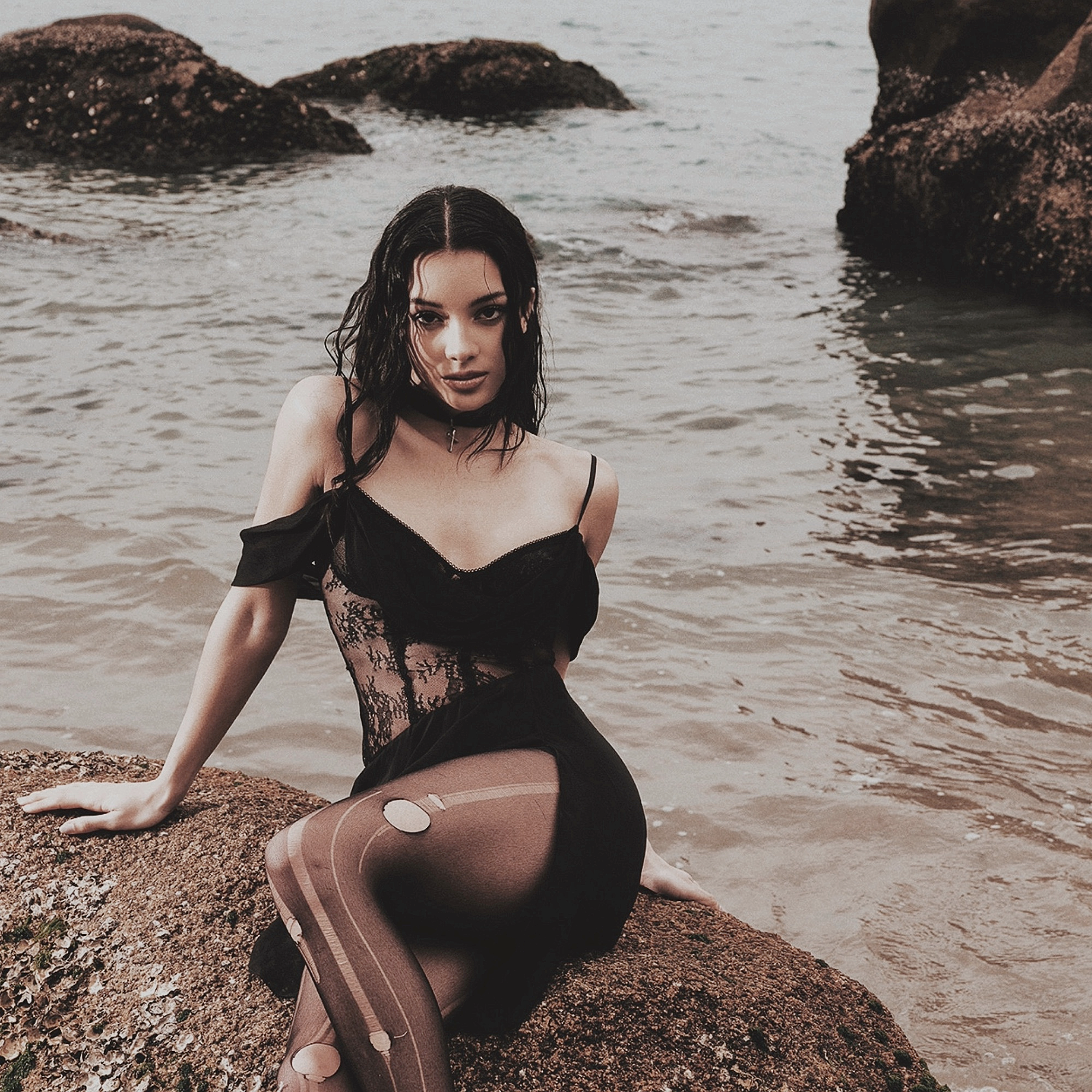 Dierama in Black is a thread of shadow, soft yet grounded. She moves like wind across dark water, with shallow V-cut cups and gentle boning shaping the body naturally under a sheer drape that hints at desire.