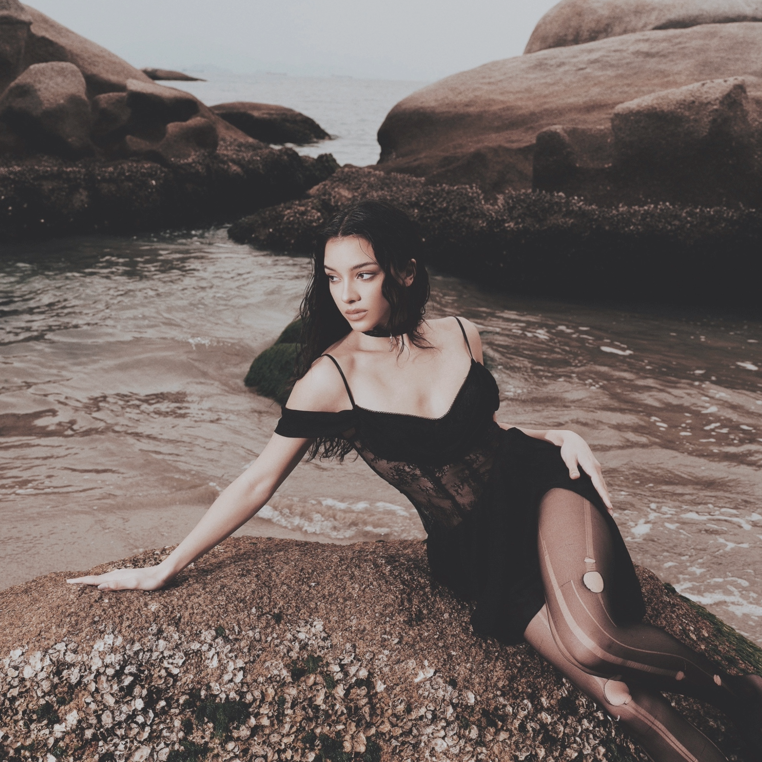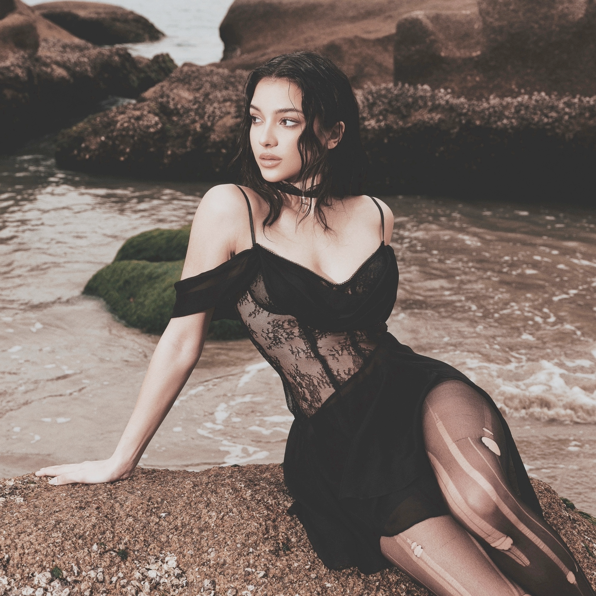 Lace panels and a layered, asymmetric skirt ripple like midnight wind. Sheer lace and satin ties at the back add a subtle, intimate touch. In black, Dierama embodies quiet nocturnal elegance—mysterious, soft, and impossible to hold.