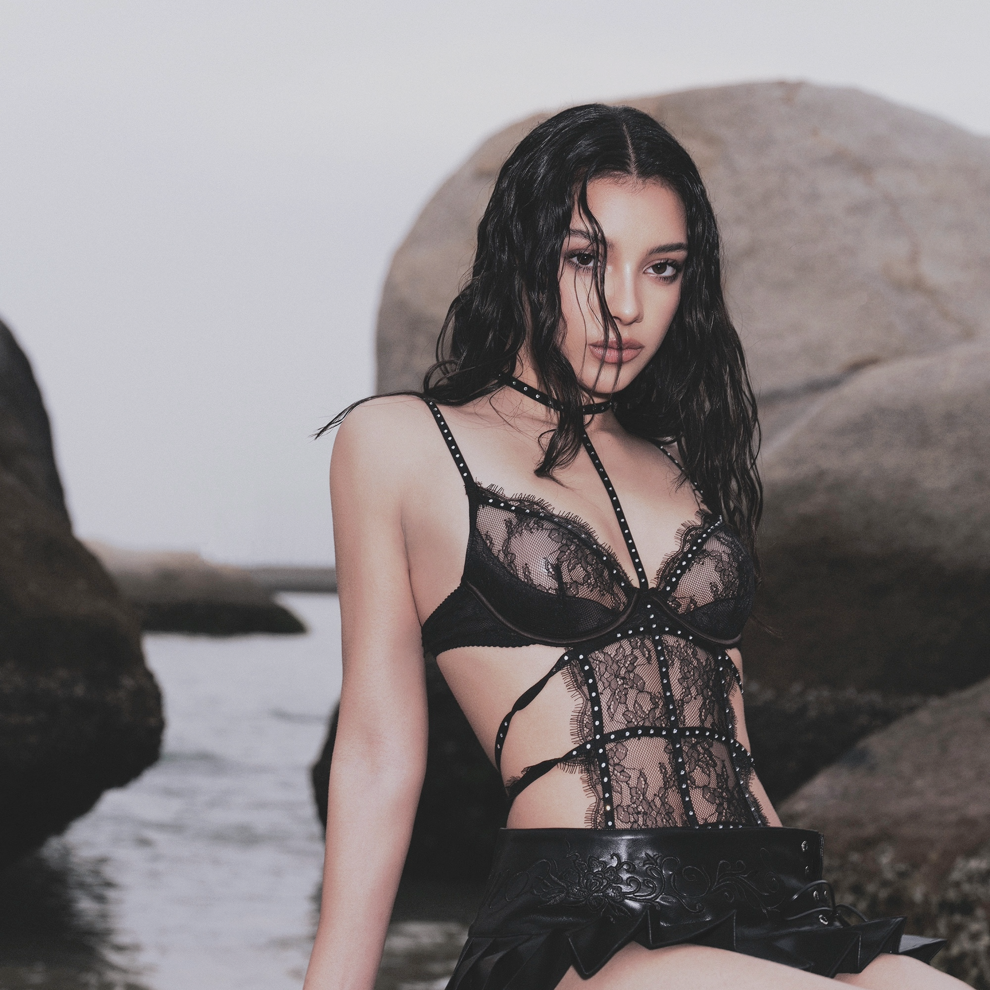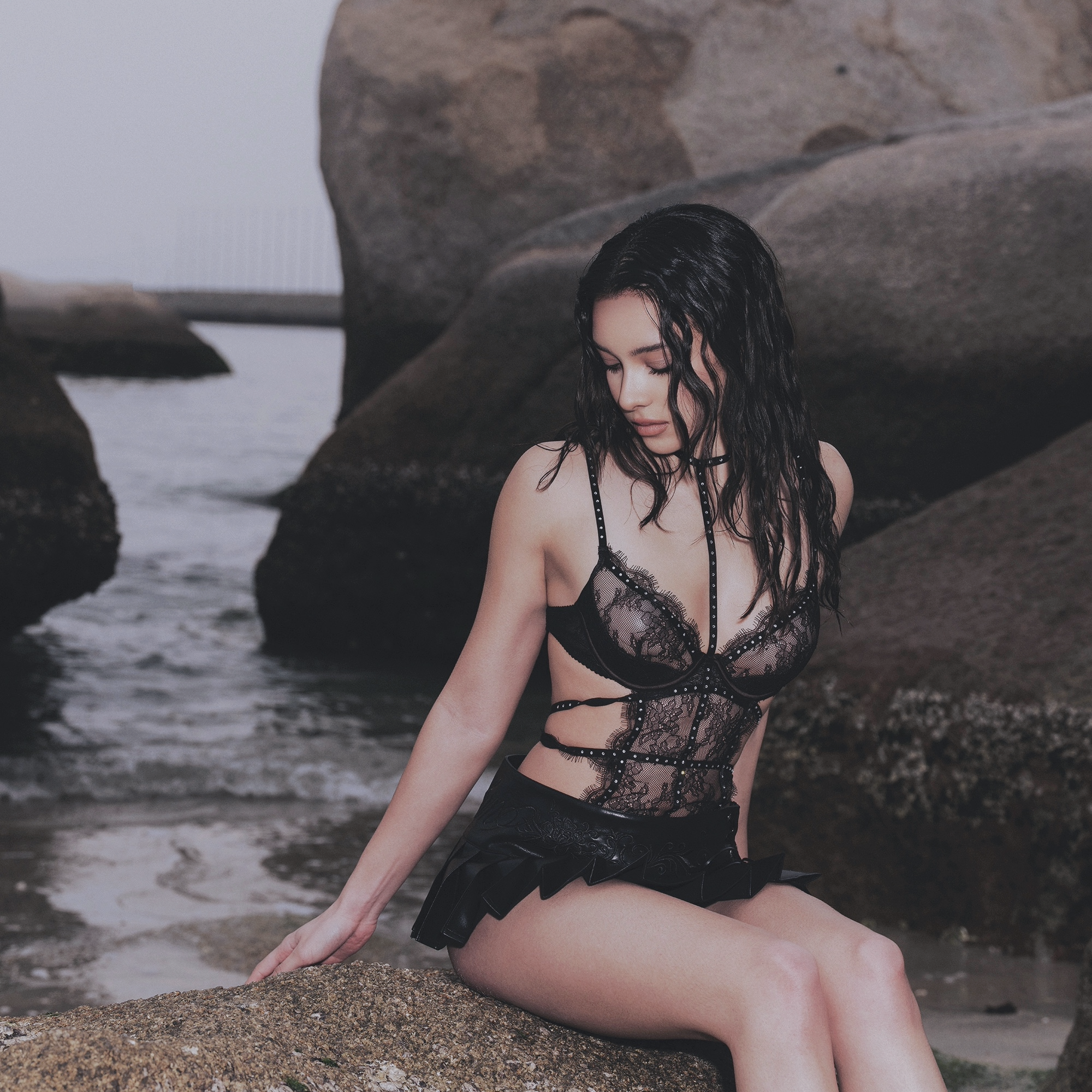 Gladiolus is a bloom of tension, where strength meets softness. Sheer mesh and embroidered lace shape a dual-layered bodice that supports while letting curves flow naturally, accented with tiny studs that glint like sparks beneath the skin.