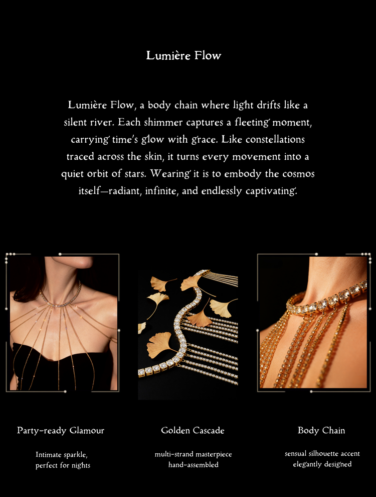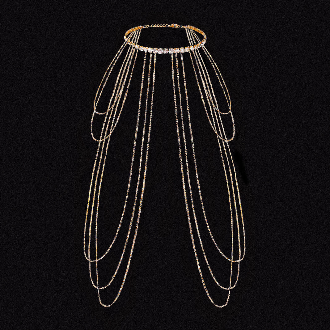 This golden body chain is crafted with dazzling cubic zirconia chains, designed to drape gracefully across your upper body. Once worn around the neck, five delicate golden chains fall naturally on each side and connect elegantly at the back, creating a look that feels both regal and refined.