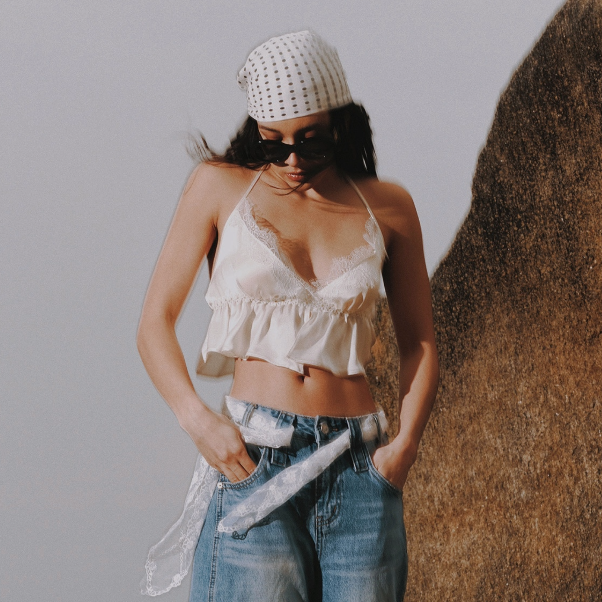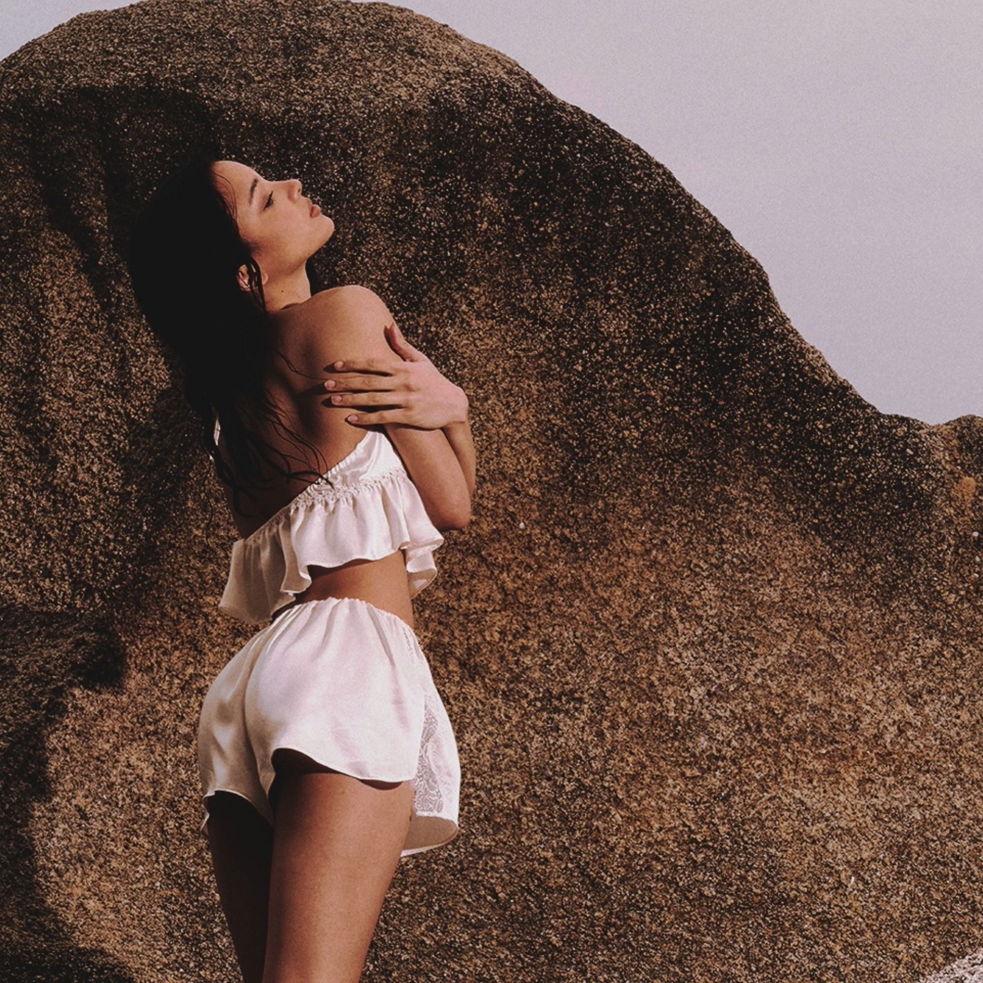 Lace panels along the sides of the shorts trace curves like moonlight through branches. Featherlight and breathable, the fabric wraps the body softly. She is a tender shield worn close to the skin—a quiet, everyday romance.